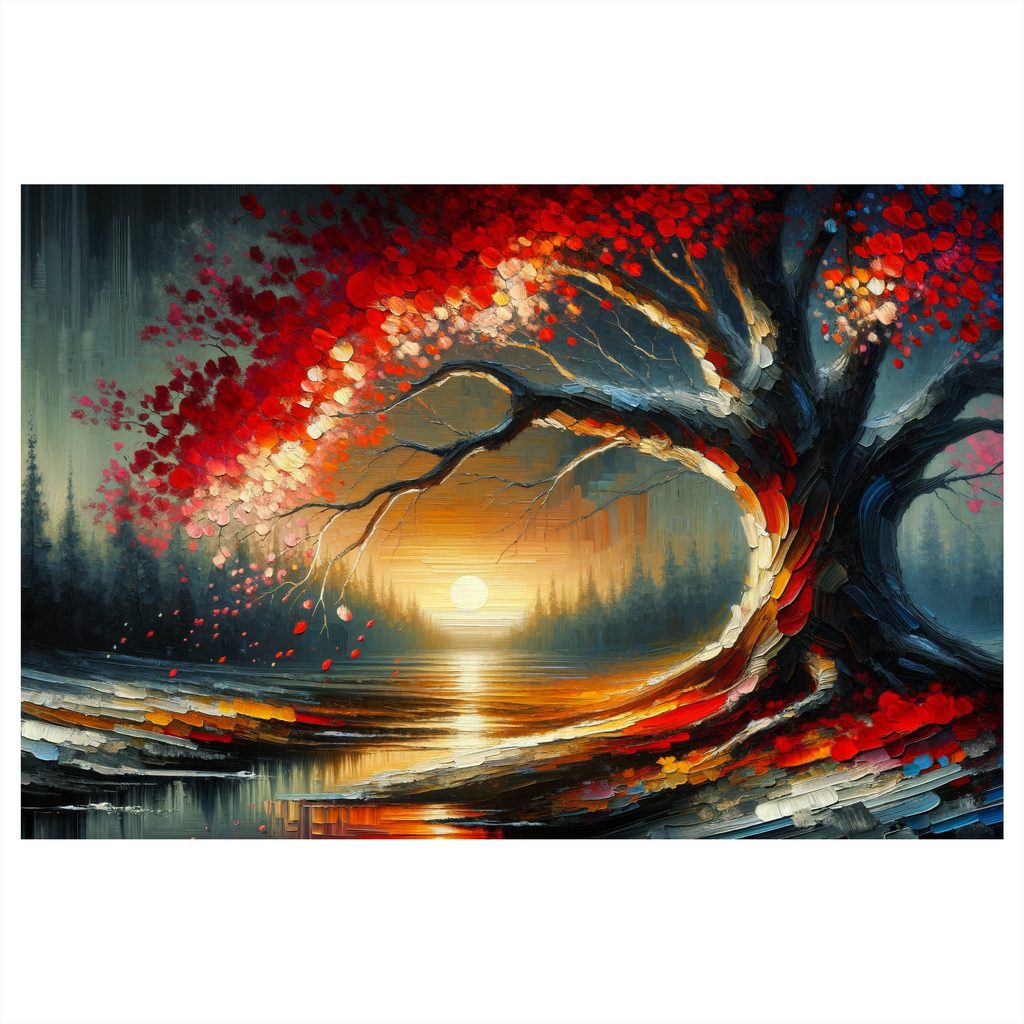 Obraz zachycující majestátní strom života při západu slunce. Výtvarné ztvárnění s bohatými detaily červených a růžových listů kontrastuje s klidným jezerem a zlatým sluncem. Teplé barvy vytvářejí romantickou a harmonickou atmosféru, ideální pro zklidnění mysli. Perfektní volba pro obývací pokoj nebo ložnici, která dodá prostoru nádech elegance a klidu. Kvalitní tisk na plátně zaručuje dlouhou životnost a živé barvy.