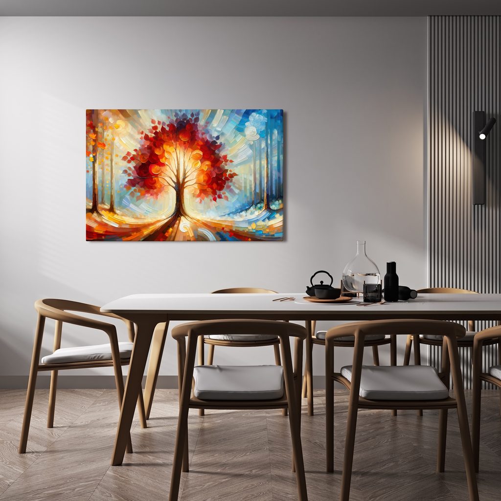 Obraz zářivého stromu života zobrazuje majestátní strom obklopený barevnými listy. Vynikající detaily a dynamické tvary vytvářejí jedinečnou atmosféru plnou energie a vitality. Teplé odstíny červené, oranžové a žluté se mísí s jemnými modrými tóny, což dodává obrazu harmonický a povzbudivý nádech. Tento obraz se skvěle hodí do obývacího pokoje nebo pracovny, kde přinese radost a inspiraci. Kvalitní zpracování a moderní design zaručují, že se stane výrazným prvkem vašeho interiéru.