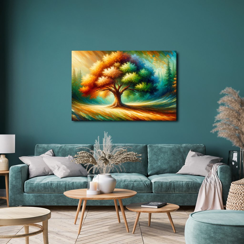 Tento obraz zobrazuje zářivý strom života v malebné krajině. Strom je bohatě zbarvený do odstínů oranžové, zelené a hnědé, což vytváří živý kontrast s pozadím. Atmosféra je plná optimismu a harmonie, díky jemným přechodům barev a dynamickým liniím. Ideálně se hodí jako dekorace do obývacího pokoje nebo pracovny, kde přinese klid a inspiraci. Obraz je vytištěn na kvalitním plátně, které zaručuje dlouhou životnost a stálost barev.