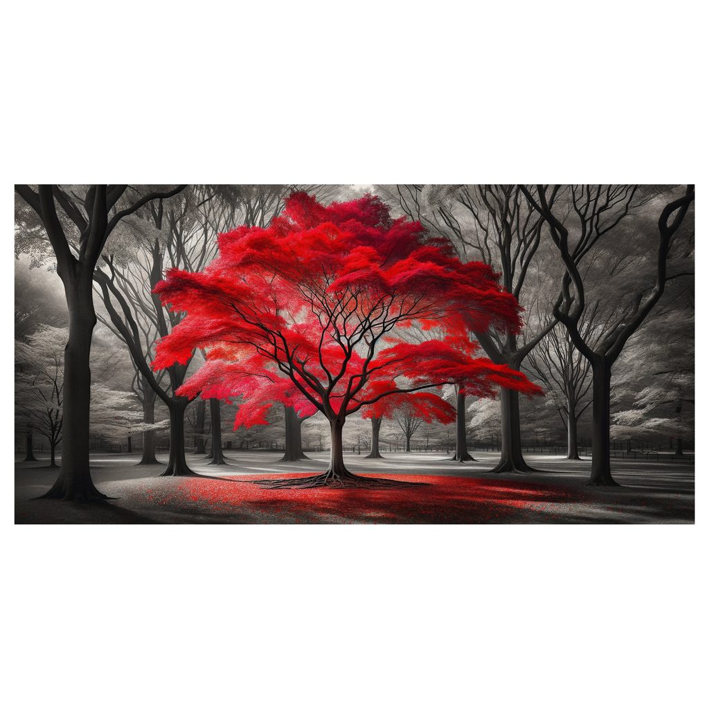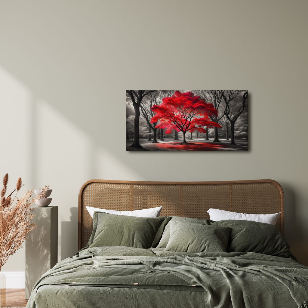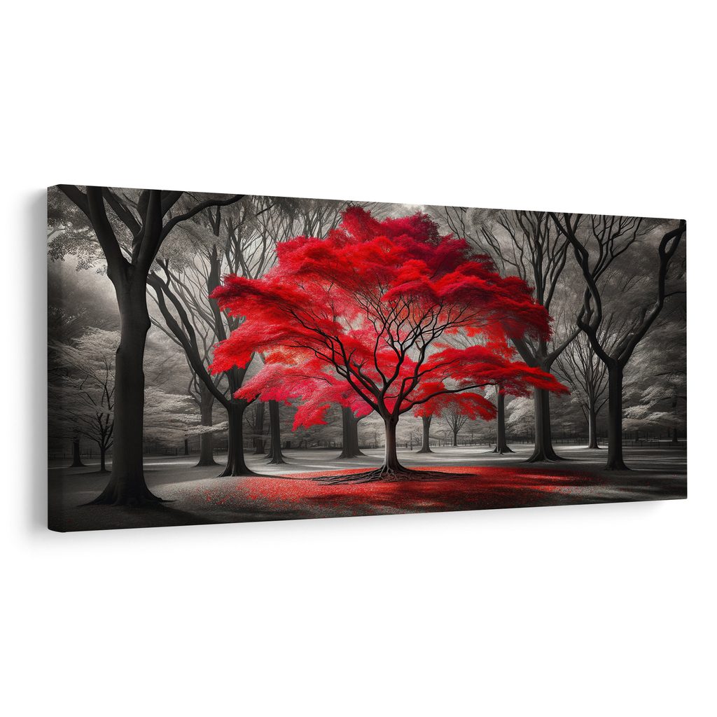Obraz zářivého stromu života v přírodě přitahuje pozornost svým výrazným motivem. Červené listy stromu kontrastují s monochromatickým pozadím, které vytváří fascinující atmosféru. Tento výjimečný kousek přináší do vašeho interiéru energii a harmonii. Ideální pro oživení obývacího pokoje nebo pracovny. Obraz je vyroben z kvalitních materiálů, což zaručuje jeho dlouhou životnost a stálost barev.