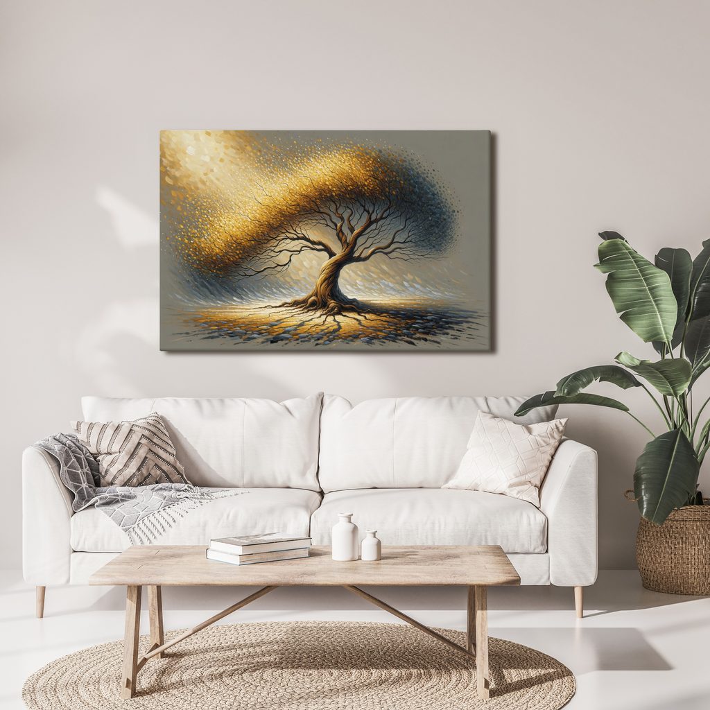 Obraz zlatého stromu života ve větru přináší do vašeho prostoru pocit dynamiky a pohybu. Detailně zpracované větve a listy se zdají být v harmonii s větrem, což dodává obrazu živost. Teplé zlaté a hnědé tóny vytvářejí útulnou a inspirativní atmosféru, ideální pro povzbuzení kreativity. Tento obraz skvěle doplní jakýkoliv interiér, ať už v obývacím pokoji, kanceláři nebo studovně. Kvalitní tisk na plátno zaručuje dlouhou životnost a nádhernou reprodukci barev.