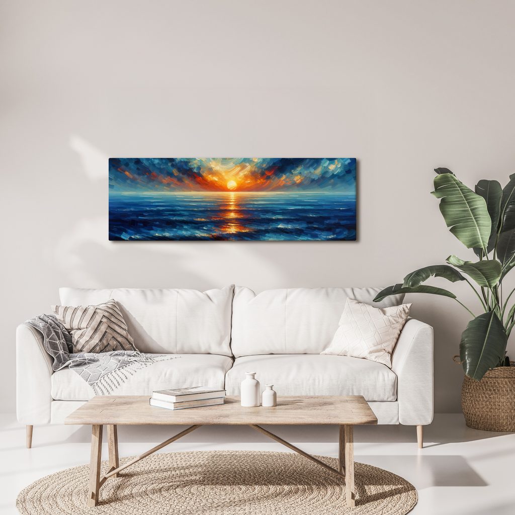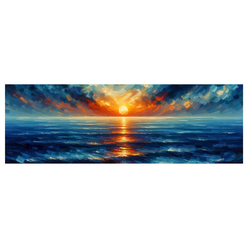 Obraz dramatické oblohy a vln se pyšní nádherným západem slunce nad mořem. Hlavním prvkem jsou bohaté modré a oranžové odstíny, které vytvářejí úchvatnou atmosféru. Dynamické tahy štětce dodávají pocit pohybu a živosti, zatímco odrazy slunce na hladině vody umocňují kouzlo okamžiku. Tento obraz je ideální pro oživení obývacího pokoje nebo pracovny, přináší klid a inspiraci. Kvalita tisku zaručuje dlouhou životnost a jasnost barev, takže váš domov získá jedinečný charakter.