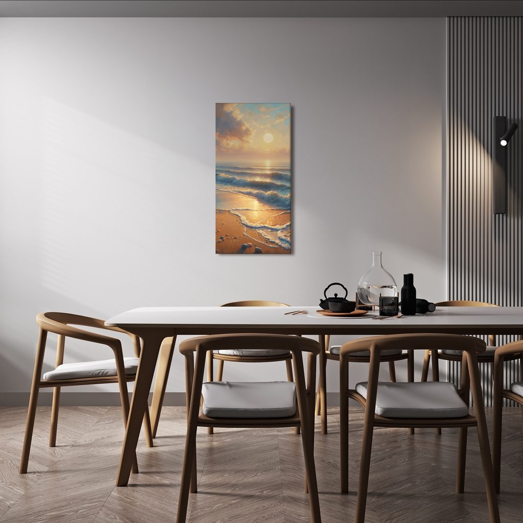 Obraz moře zalitého sluncem zachycuje klidnou atmosféru na pláži při východu slunce. Detaily jako jemné vlny a třpytící se písek vytvářejí harmonický obraz přírody. Teplé odstíny oranžové a modré barvy podtrhují příjemnou a relaxační náladu. Tento obraz je ideální pro zdobení obývacích pokojů či ložnic, kde přinese pocit pohody. Kvalitní tisk na plátno zajistí dlouhou životnost a živé barvy, které oživí každý interiér.