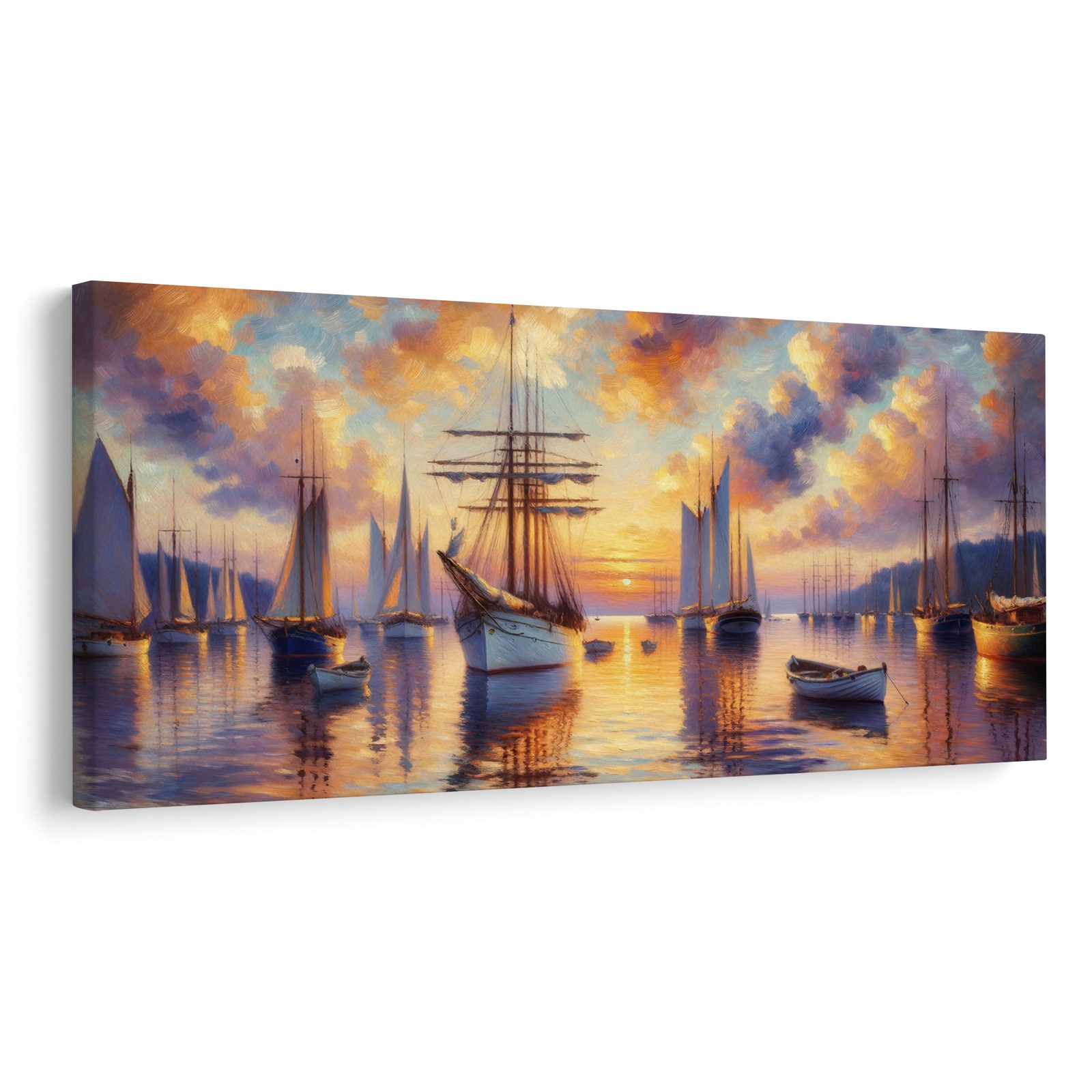 Obraz tiché lodě na hladině zachycuje klidnou atmosféru přístavu za soumraku. Na obraze se nachází několik plachetnic s rozvinutými plachtami, které se odrážejí na hladině vody, zatímco na obzoru svítí teplé barvy západu slunce. Paleta jemných oranžových, růžových a modrých tónů vytváří harmonickou a uklidňující náladu. Tento obraz je ideálním doplňkem do obývacího pokoje nebo kanceláře, kde přinese pocit klidu a pohody. Vyrobeno s důrazem na kvalitu, zaručuje dlouhou životnost a snadnou údržbu.