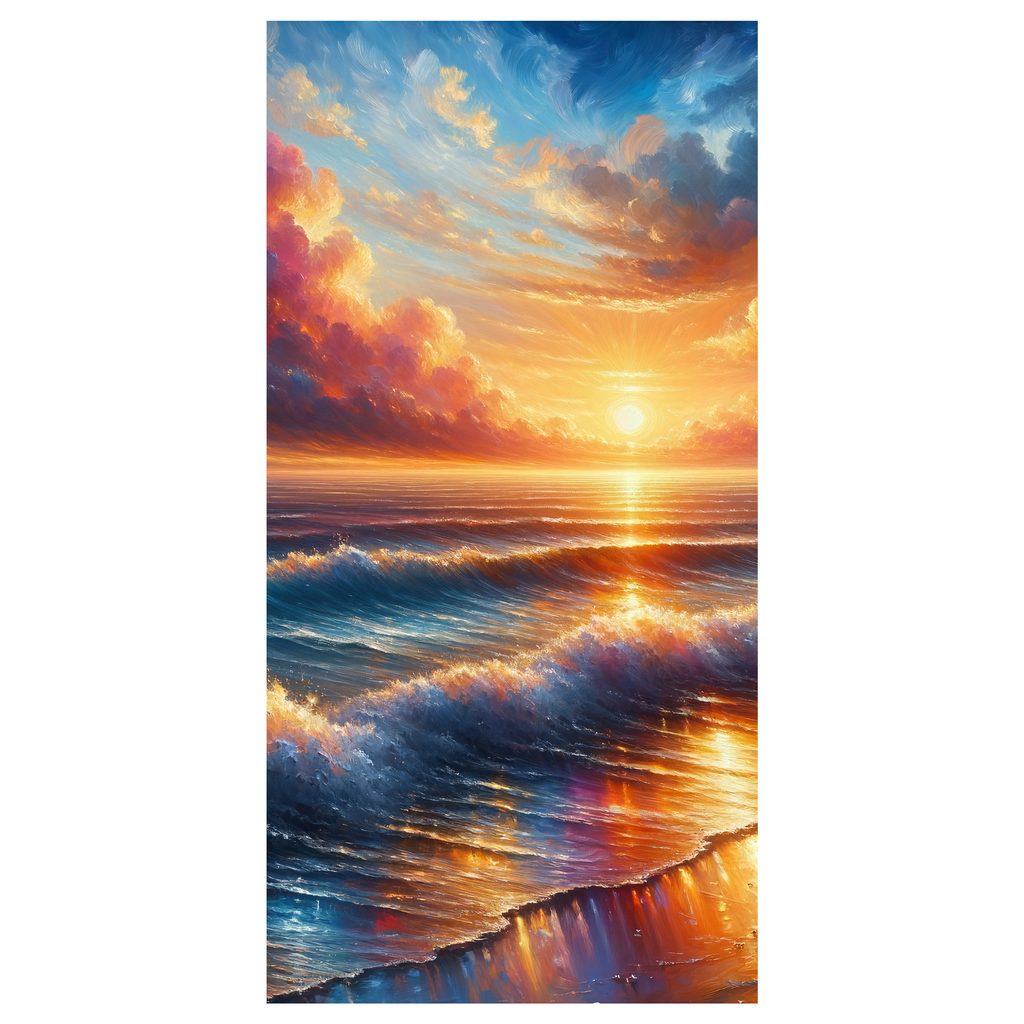 Obraz zachycující vlny při západu slunce přináší klidnou atmosféru. Detaily vln a slunečního svitu tvoří nádhernou harmonii, která okouzlí každého diváka. Teplé odstíny oranžové, žluté a modré barvy evokují pocit pohody a relaxace. Tento obraz je ideální pro výzdobu obývacích pokojů, ložnic nebo pracovních prostor. Vyrobeno z kvalitních materiálů, zaručuje dlouhou životnost a stálost barev.