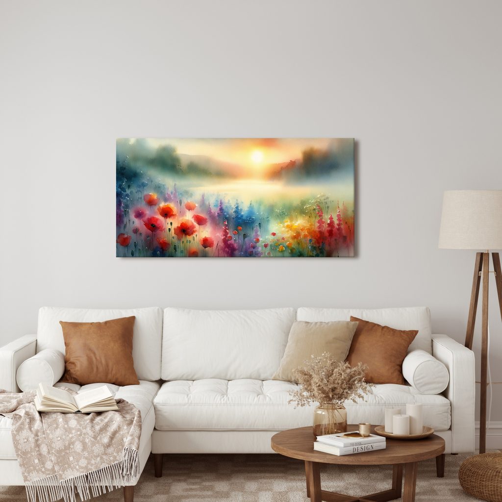 Obraz zářivá květinová krajina zachycuje nádhernou scenérii plnou květin v různých barvách. Dominují zde jasně červené máky, modré a fialové květiny, které vytvářejí harmonický kontrast. Barevná paleta je živá a veselé odstíny přispívají k pozitivní atmosféře, zatímco jemné sluneční světlo dodává motivu útulný nádech. Tento obraz je ideální jako dekorace do obývacího pokoje nebo ložnice, přinese klid a radost do každého prostoru. Kvalitní tisk na plátno zaručuje dlouhou životnost a trvanlivost barev.