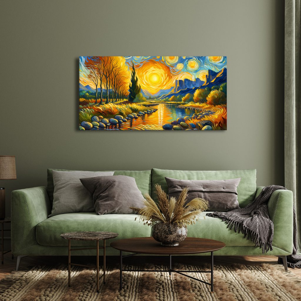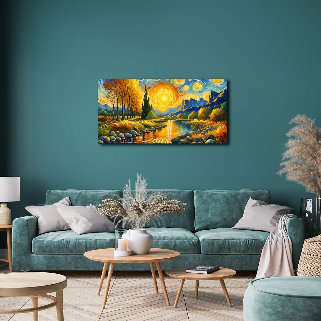 Obraz zlatého toku řeky zachycuje kouzelnou scenérii přírody s teplými tónami. V popředí se vine klidná řeka, obklopená zlatavými stromy a elegantními kameny, zatímco na horizontu se tyčí majestátní hory. Barvy jako zlatá, oranžová a modrá vytvářejí harmonickou atmosféru, která evokuje pocit klidu a pohody. Tento obraz je ideální pro oživení vašeho interiéru a dodání mu útulného nádechu. Kvalita tisku zajišťuje živé barvy a detailní zobrazení, které potěší každého milovníka umění.