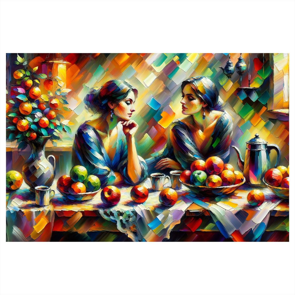 Obraz dámy u stolu s ovocem zachycuje elegantní moment s dvěma ženami, které se zamýšlejí. Na stole je bohatý výběr ovoce, včetně jablek a citrusů, doplněný o šálky a konvici. Dominují živé barvy, které vytvářejí veselou a teplou atmosféru. Tento obraz je ideální pro oživení interiéru a dodání nádechu elegance do vašeho domova. Kvalitní zpracování zaručuje dlouhou životnost a jasnost barev.