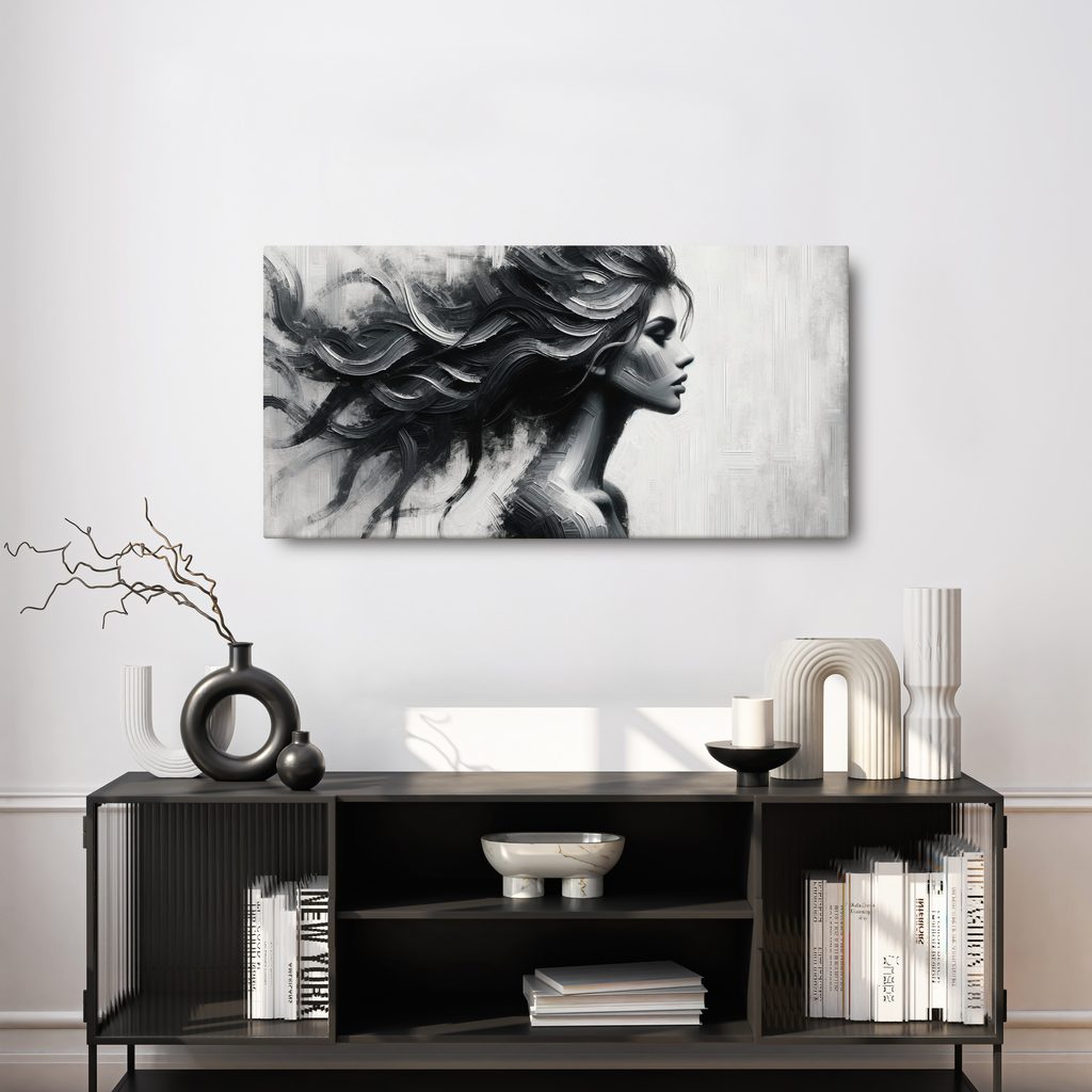 Obraz zachycuje dynamické vlasy v pohybu, které vytvářejí dojem elegance a živosti. Detaily tváře a vlasů jsou ztvárněny v moderním abstraktním stylu s výraznými tahy štětce. Dominantní černobílé tóny dodávají kompozici dramatický nádech a působí nadčasově. Tento obraz skvěle ozdobí vaše interiéry a vnese do nich inspirativní atmosféru. Vysoce kvalitní tisk na plátno zaručuje dlouhou životnost a atraktivní vzhled.