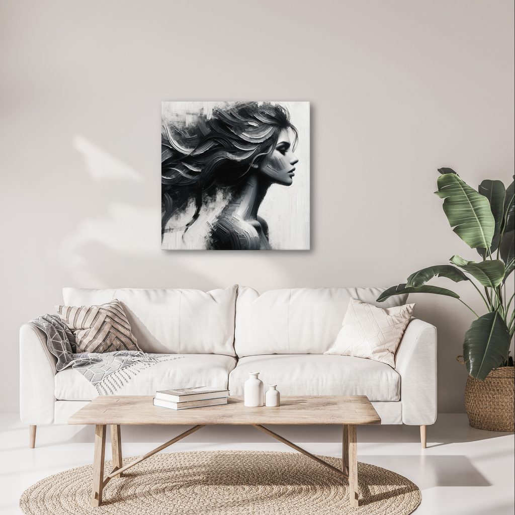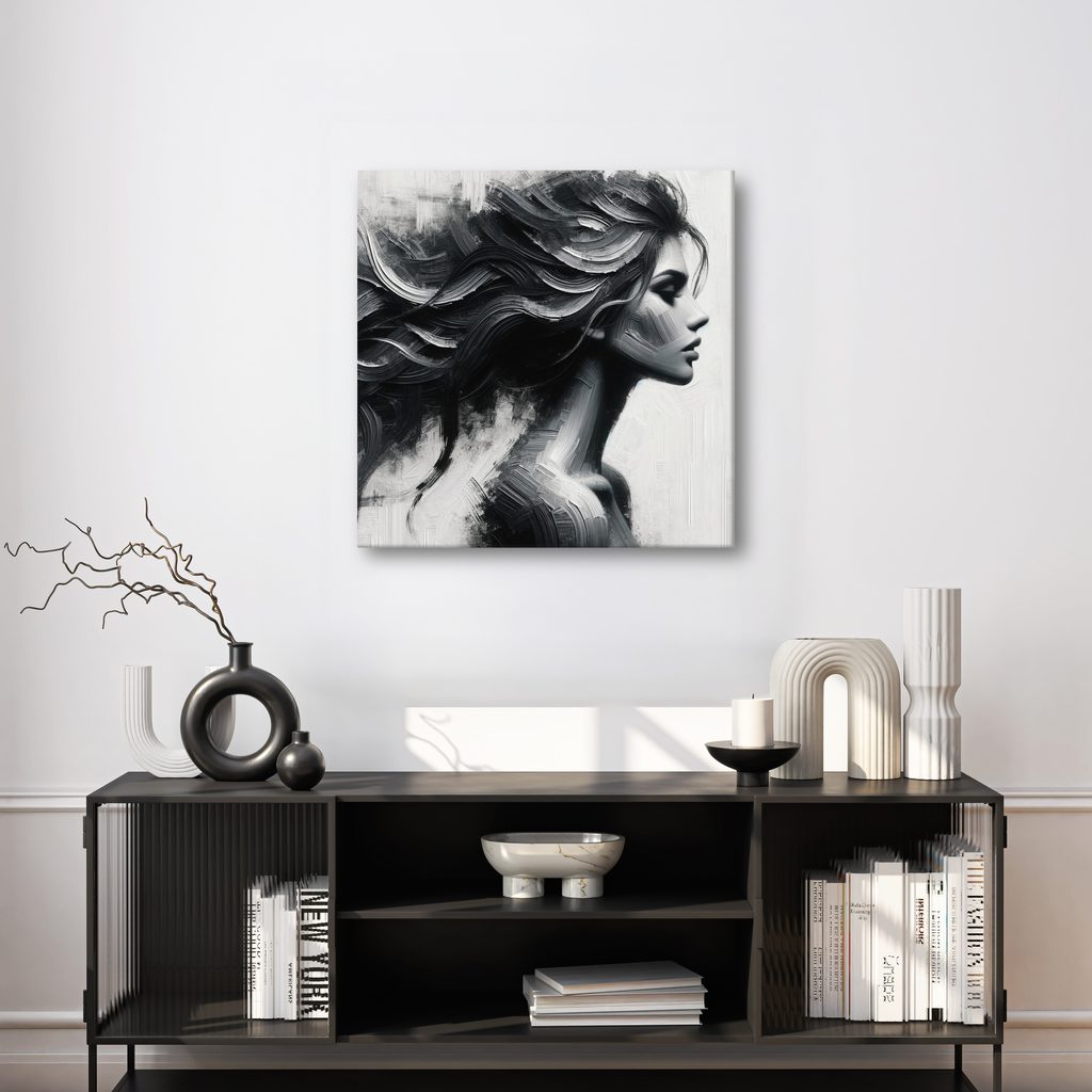 Obraz zachycuje elegantní siluetu ženy s nádhernými vlasy, které se volně vlní. Detailní textury a kontrast černé a bílé vytvářejí fascinující hloubku a pohyb. Atmosféra je tajemná a sofistikovaná, ideální pro moderní interiéry. Tento obraz se skvěle hodí do obývacího pokoje nebo ložnice, kde podtrhne stylový design. Kvalitní zpracování zaručuje dlouhou životnost a působivý vzhled.