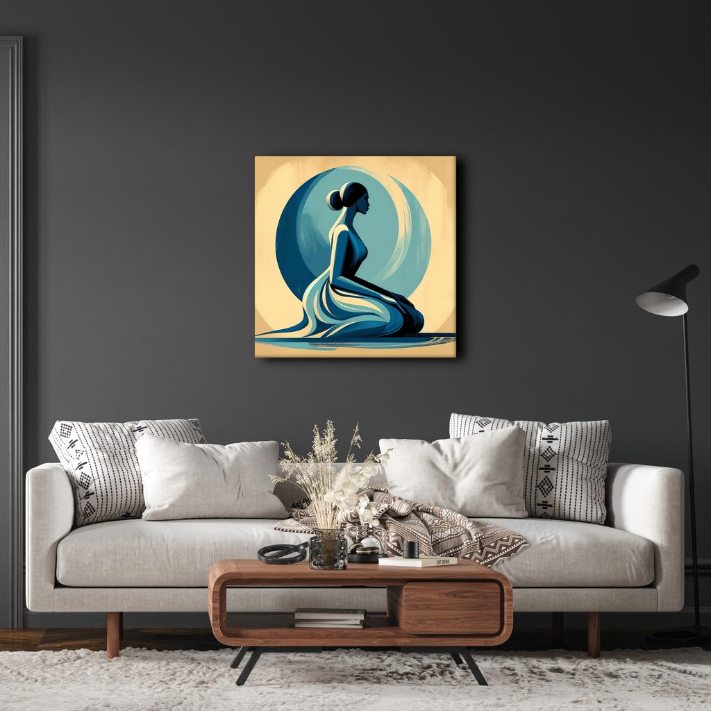 Obraz s klidnou siluetou ženy před měsícem evokuje atmosféru harmonie a klidu. Hlavní motiv zobrazuje elegantní postavu, která sedí v meditačním postoji, obklopenou jemnými křivkami a decentními detaily. Barevné provedení v modrých a béžových odstínech vytváří příjemnou a uklidňující náladu, ideální pro relaxaci. Tento obraz se skvěle hodí do obytných prostor, jako jsou obývací pokoje nebo ložnice, kde přinese pocit útulnosti. Obraz je vytištěn na kvalitním plátně s důrazem na detail a dlouhou životnost.