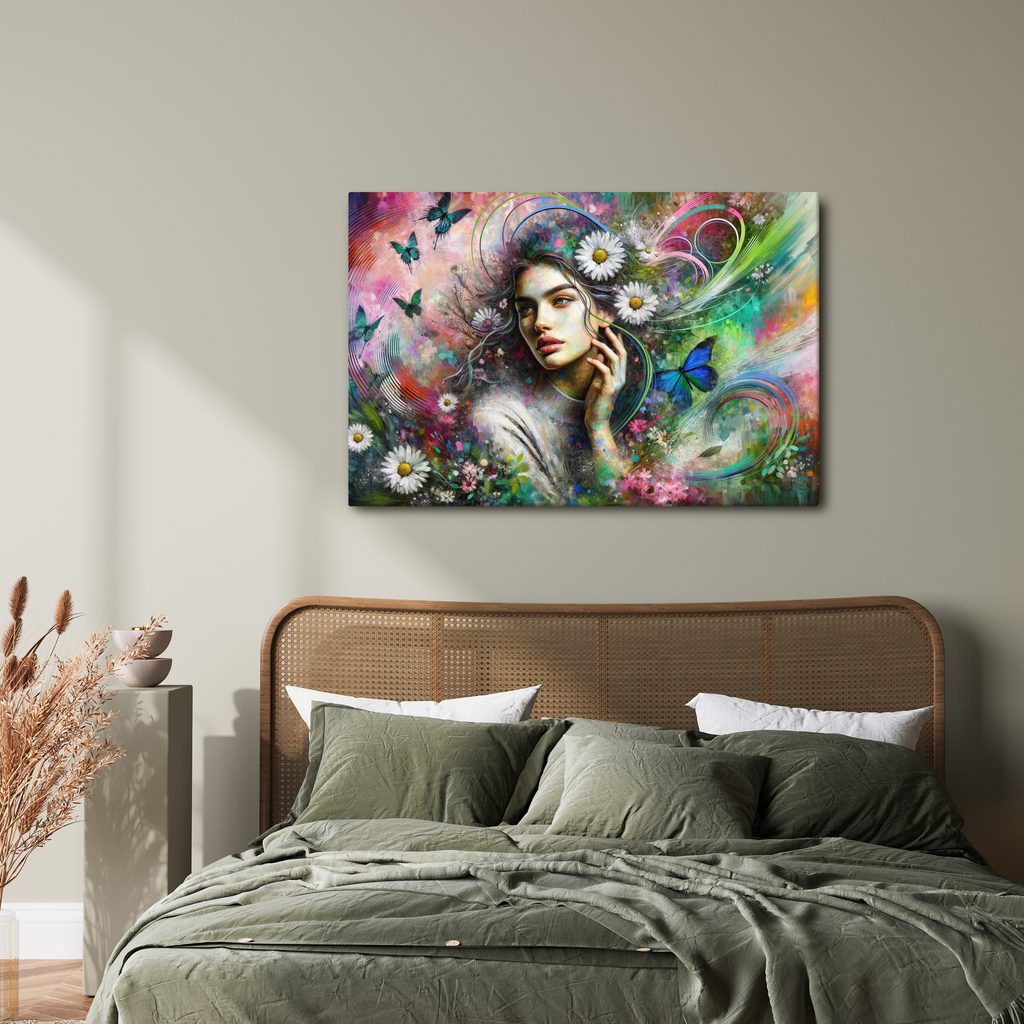 Obraz květinové harmonie s motýly zobrazuje nádhernou ženu obklopenou pestrými květinami a motýly. Detaily, jako jsou bílé sedmikrásky a modří motýli, dodávají motivu živost a lehkost. Dominují jemné pastelové barvy, které vytvářejí harmonickou a uklidňující atmosféru. Tento obraz je ideální volbou pro oživení interiéru a přináší pocit pohody. Kvalita tisku zajišťuje dlouhou životnost a krásu každého detailu.