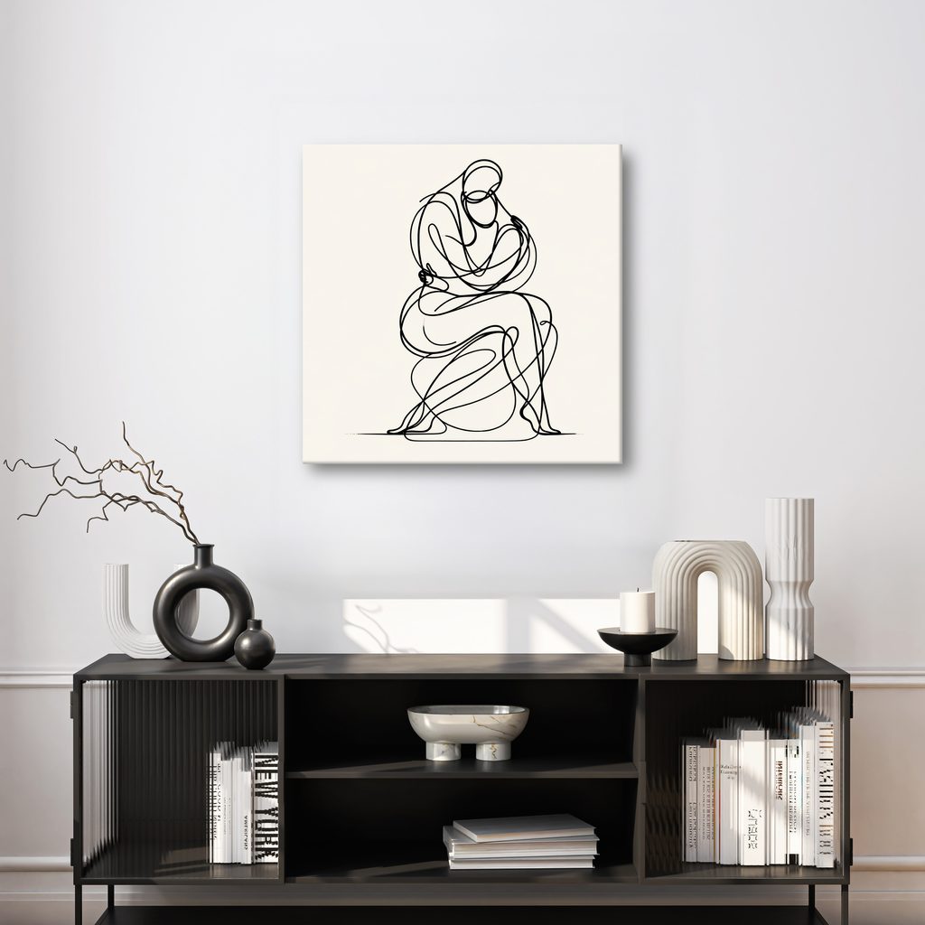 Obraz zachycuje zamyšlenou siluetu s elegantními křivkami. Motiv je ztvárněn jednoduchou černou linií na jemném světlém pozadí, což vytváří kontrast a zdůrazňuje jeho minimalistický styl. Atmosféra obrazu je klidná a introspektivní, ideální pro povzbuzení zamyšlení. Tento obraz skvěle doplní moderní interiéry a přinese do prostoru umělecký nádech. Kvalitní tisk na plátně zajišťuje dlouhou životnost a estetický vzhled.