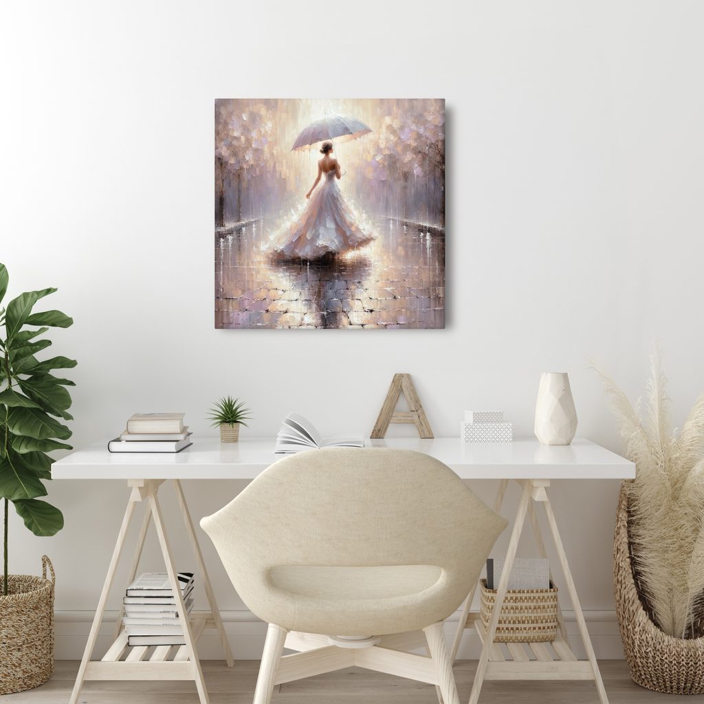 Obraz zachycuje ženu kráčející v dešti s deštníkem. Hlavním prvkem je její elegantní bílá šaty, které se ladně vlní při chůzi, a pozadí s jemnými odstíny růžové a šedé. Atmosféra je romantická a snová, evokující klidné a nostalgické pocity. Tento obraz je ideální pro zdobení obývacích pokojů nebo ložnic, kde přináší šarm a jemnost. Kvalita tisku a materiál zajistí dlouhou životnost a krásu tohoto uměleckého díla.