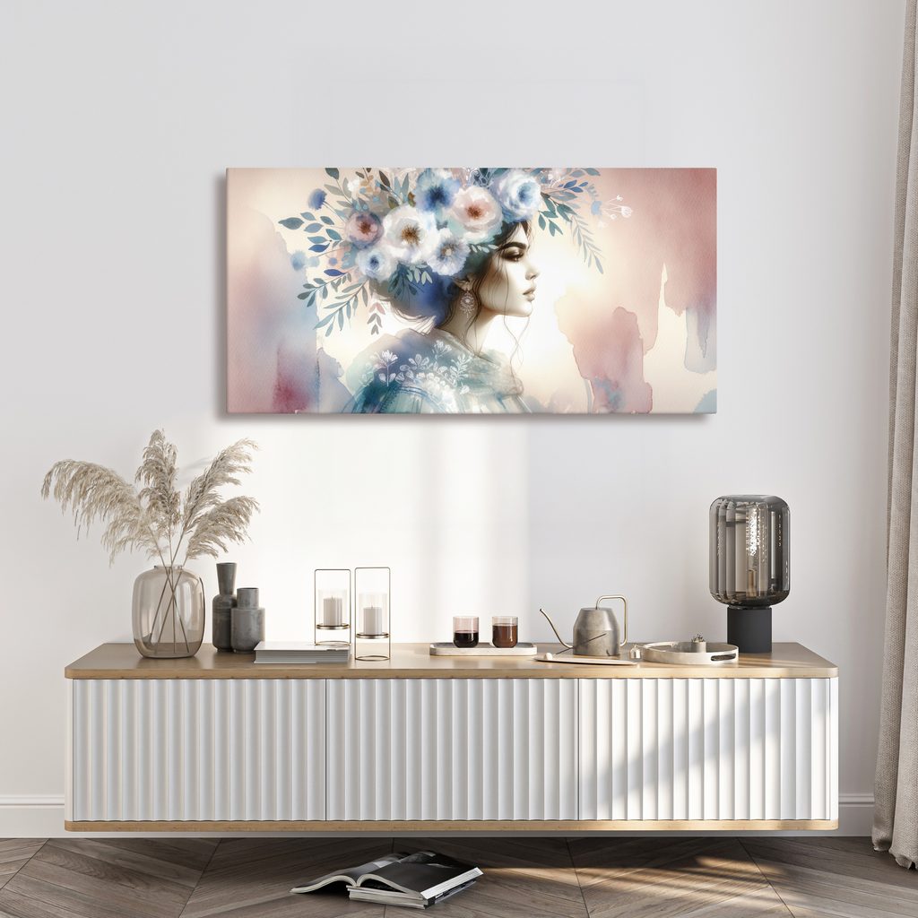 Obraz zachycuje ženskou postavu s nádhernou květinovou korunou. Detailně zpracované květiny v jemných odstínech modré a bílé doplňují elegantní rysy tváře. Celková atmosféra je romantická a vzdušná, s jemnými pastelovými barvami pozadí. Tento obraz se skvěle hodí do moderních interiérů jako originální dekorace. Naše obrazy jsou vyrobeny z kvalitního materiálu, který zajišťuje dlouhou životnost a stálost barev.