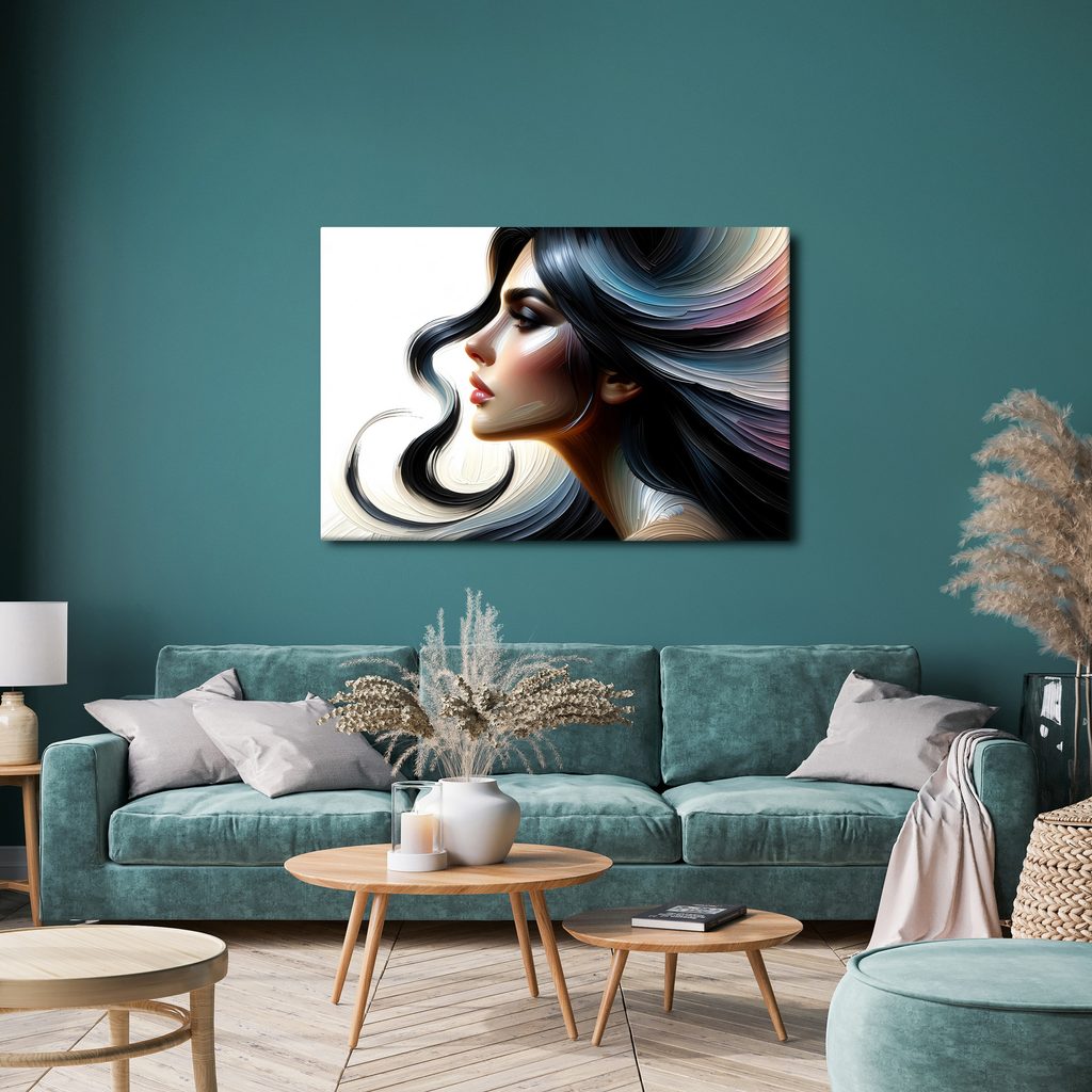 Obraz zobrazuje ženu s větrnými vlasy, zachycující elegantní pohyb a krásu. Detaily obličeje a vlasů jsou ztvárněny dynamickými tahy, které vytvářejí dojem lehkosti a svobody. Barevná paleta kombinuje jemné odstíny modré a bílé, což podtrhuje klidnou a vzdušnou atmosféru. Tento obraz je ideální jako dekorace do moderního interiéru, který potřebuje oživení. Kvalitní tisk na plátno zajišťuje dlouhou životnost a živé barvy.
