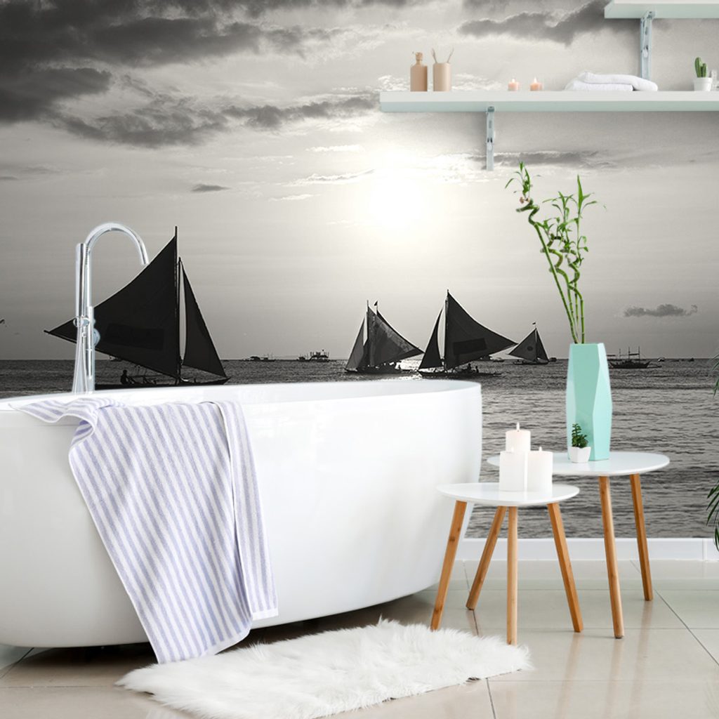 Samolepící fototapeta zachycuje nádherný západ slunce na moři v černobílém provedení. Na obraze se objevují plachetnice, které klidně plují po hladině, odrážející se ve vodě. Celková atmosféra je klidná a nostalgická, s jemnými odstíny šedi, které dodávají motivu eleganci. Tato tapeta je ideální pro vytvoření relaxačního prostoru v obývacím pokoji nebo ložnici. Produkt je vyroben z kvalitního materiálu, který zajišťuje snadnou aplikaci a dlouhou životnost.