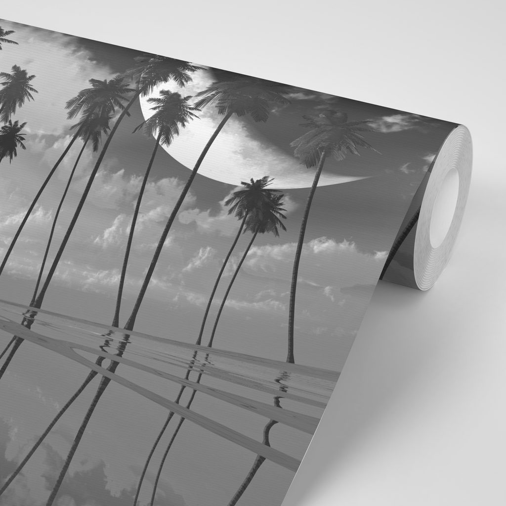 Samolepící tapeta s černobílými tropickými palmami přináší do vašeho prostoru nádech exotiky. Hlavní motiv tvoří elegantní siluety palem, které se odrážejí na klidné vodní hladině, doplněné majestátními obláčky a lunárním svitem. Kombinace černé a bílé barvy vytváří moderní, sofistikovanou atmosféru, která osvěží jakýkoli interiér. Ideální pro obývací pokoje, ložnice nebo kanceláře, kde dodá stylový vzhled. Tapeta je vyrobena z kvalitního materiálu, což zaručuje snadnou aplikaci a dlouhou životnost.