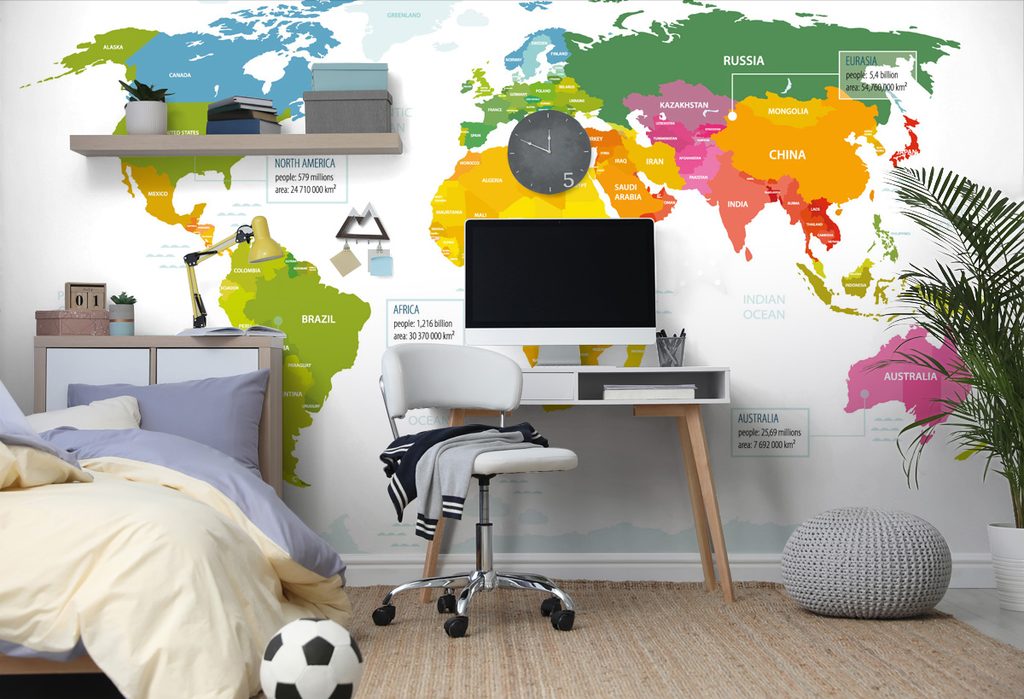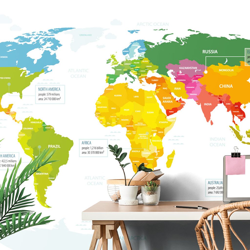 Samolepící tapeta s výjimečnou mapou světa na bílém pozadí přináší do vašeho interiéru moderní a vzdělávací prvek. Motiv mapy je barevně rozlišený a obsahuje informace o populaci a rozloze jednotlivých oblastí. Svěží barvy a přehlednost dodávají tapetě hravou atmosféru, která oživí každou místnost. Ideální pro děti, studenty nebo jako inspirativní prvek v pracovním prostoru. Kvalita materiálu zaručuje snadnou aplikaci a dlouhou životnost bez poškození stěn.