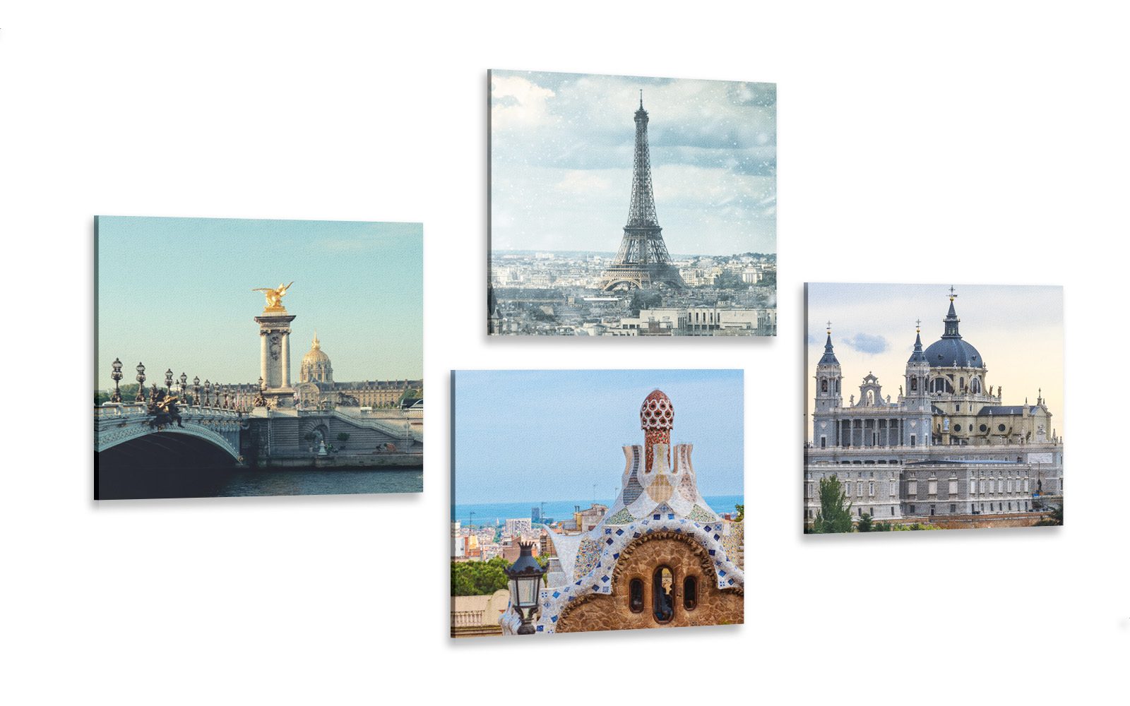 Set obrazů "Sen cestovatele" zachycuje ikonické evropské památky. Motivy zahrnují Eiffelovu věž, most Alexandre III a další architektonické skvosty. Barvy jsou jemné a nostalgické, evokující atmosféru romantických cest. Tento set je ideální pro milovníky cestování a umění, kteří chtějí ozdobit svůj interiér. Obrazy jsou vyrobeny z kvalitního materiálu, což zaručuje dlouhou životnost a barevnou stálost.