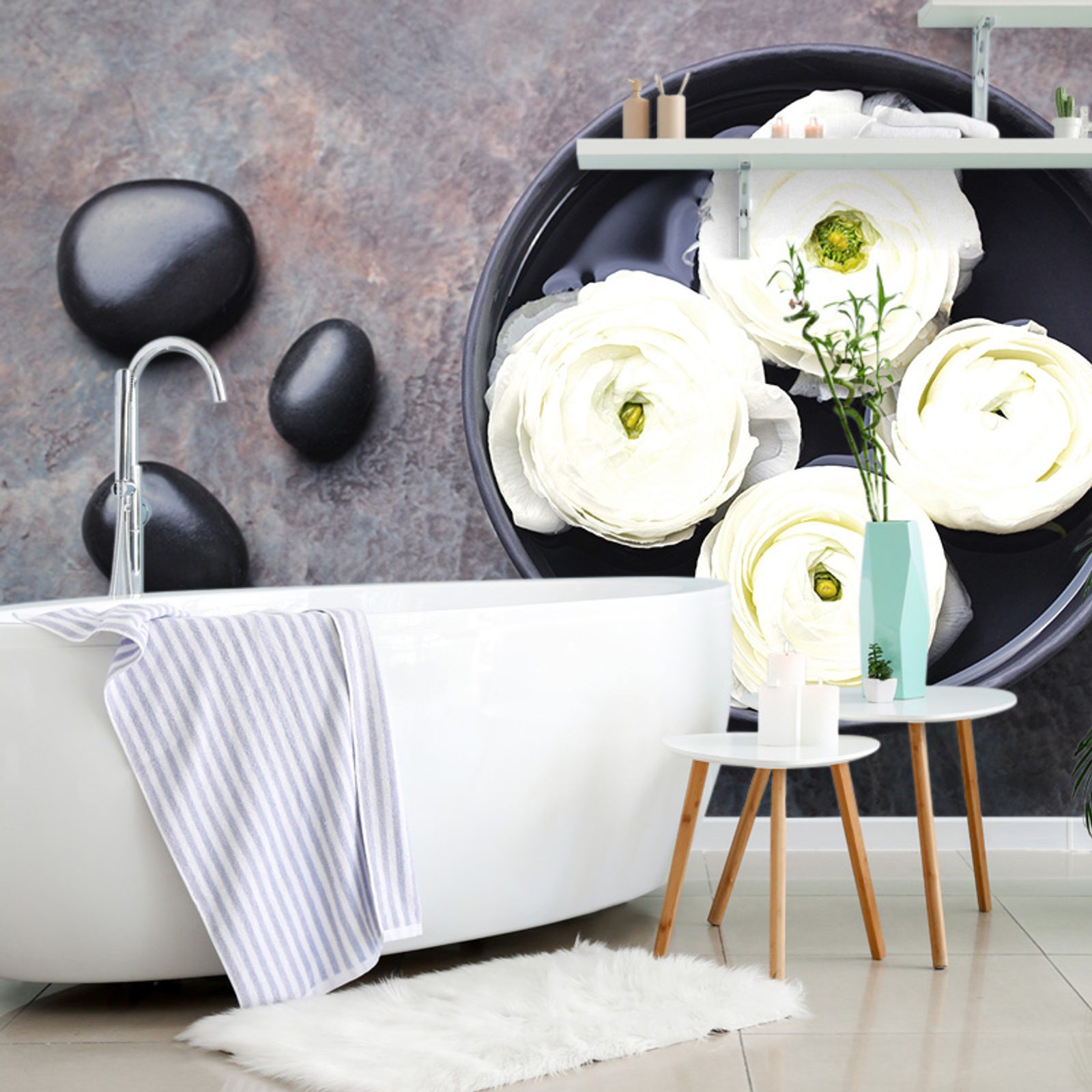 Zátiší se Zen kameny a květy vytváří harmonickou atmosféru klidu. Na tmavém pozadí se elegantně vznášejí bílé květy s jemnými detaily a zelenými středy, obklopené černými kameny. Barevná paleta v černé, bílé a zelené evokuje pocit relaxace a vyrovnanosti. Ideální pro vytvoření uklidňujícího prostředí v obývacím pokoji nebo wellness prostoru. Fototapeta je vyrobena z kvalitního materiálu, který zajišťuje dlouhou životnost a snadnou aplikaci.