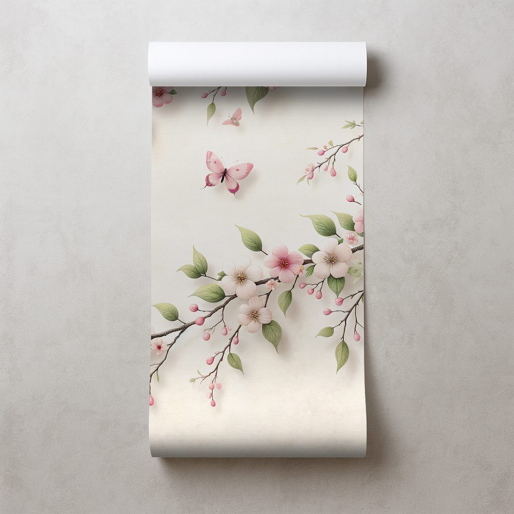 Jemné růžové květy a motýli tvoří romantický a svěží motiv této fototapety. Na pozadí se proplétají větve s květy v různých odstínech růžové a bílé, doplněné o barevné motýly. Celková atmosféra vyzařuje lehkost a eleganci, ideální pro útulné interiéry. Tato tapeta je skvělou volbou pro oživení obývacího pokoje nebo ložnice. Vysoce kvalitní tisk zajišťuje trvanlivost a živost barev.
