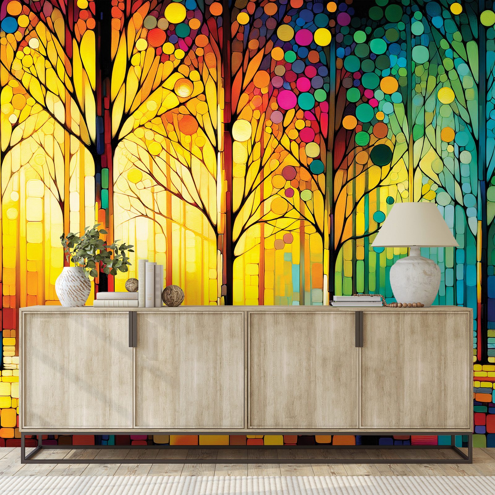 Barevná lesní mozaika přináší do vašeho interiéru živou atmosféru přírody. Motiv zobrazuje stromy obklopené pestrými barevnými detaily, které vytvářejí efekt jako z vitráží. Teplé žluté a oranžové tóny se harmonicky mísí s chladnými modrými a zelenými, což navozuje pocit klidu a pohody. Tato tapeta je ideální pro oživení obývacího pokoje nebo pracovny. Samolepící materiál zaručuje snadnou aplikaci a kvalitní provedení zajistí dlouhou životnost.
