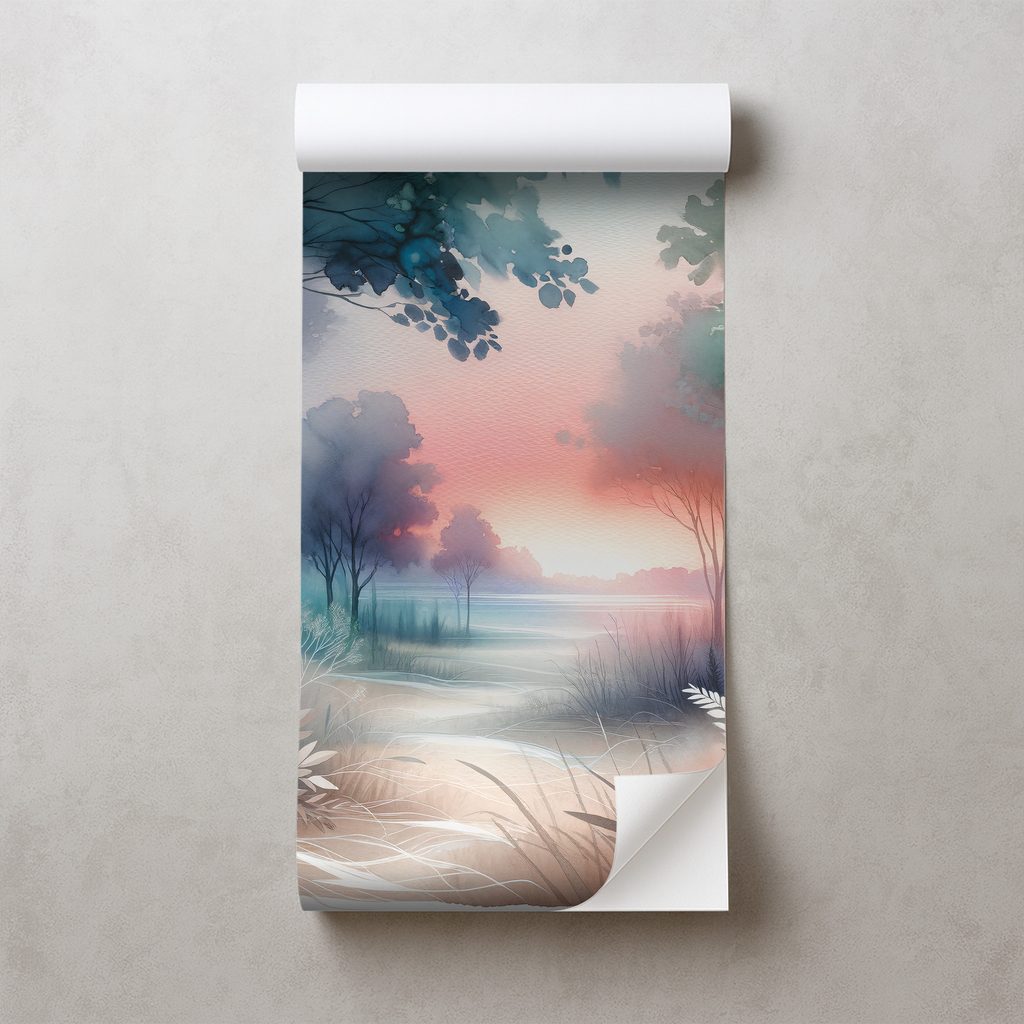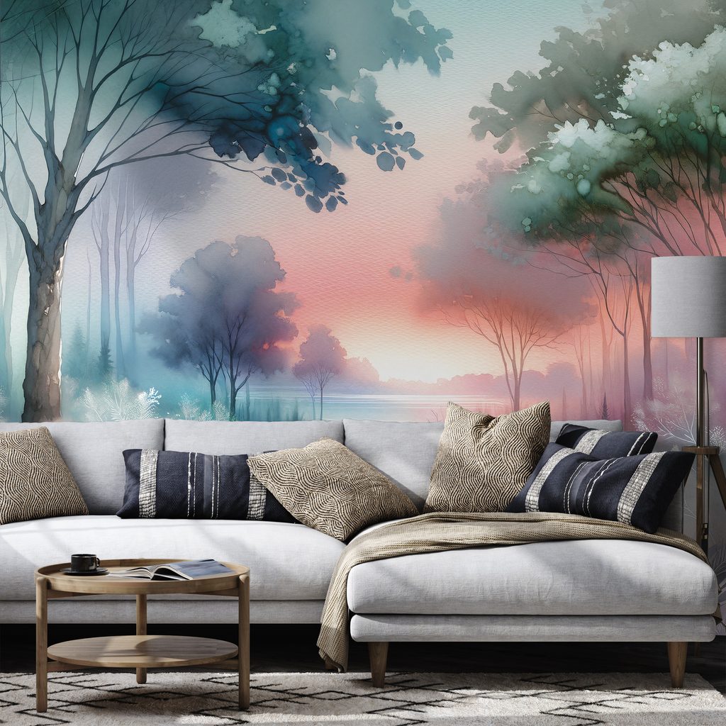 Samolepící tapeta pastelová lesní krajina při západu slunce