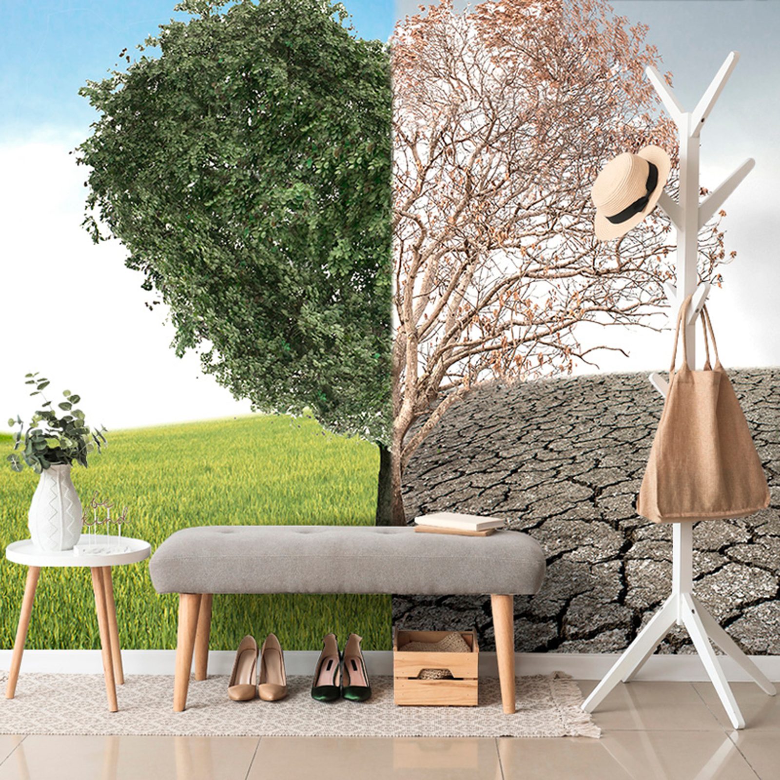 Motiv tapety zobrazuje strom ve dvou kontrastních podobách, jedné bujné a zelené, druhé suché a bezlisté. Na levé straně vidíme svěží zeleň s modrou oblohou, zatímco pravá strana ukazuje vyprahlou krajinu s šedým pozadím. Tato kombinace symbolizuje cykly přírody a proměny života. Tapeta je ideální pro moderní interiéry, kde můžete vyjádřit kontrasty a přírodní krásu. Produkt je vyroben z kvalitního materiálu, který zaručuje dlouhou životnost a snadnou aplikaci na stěnu.