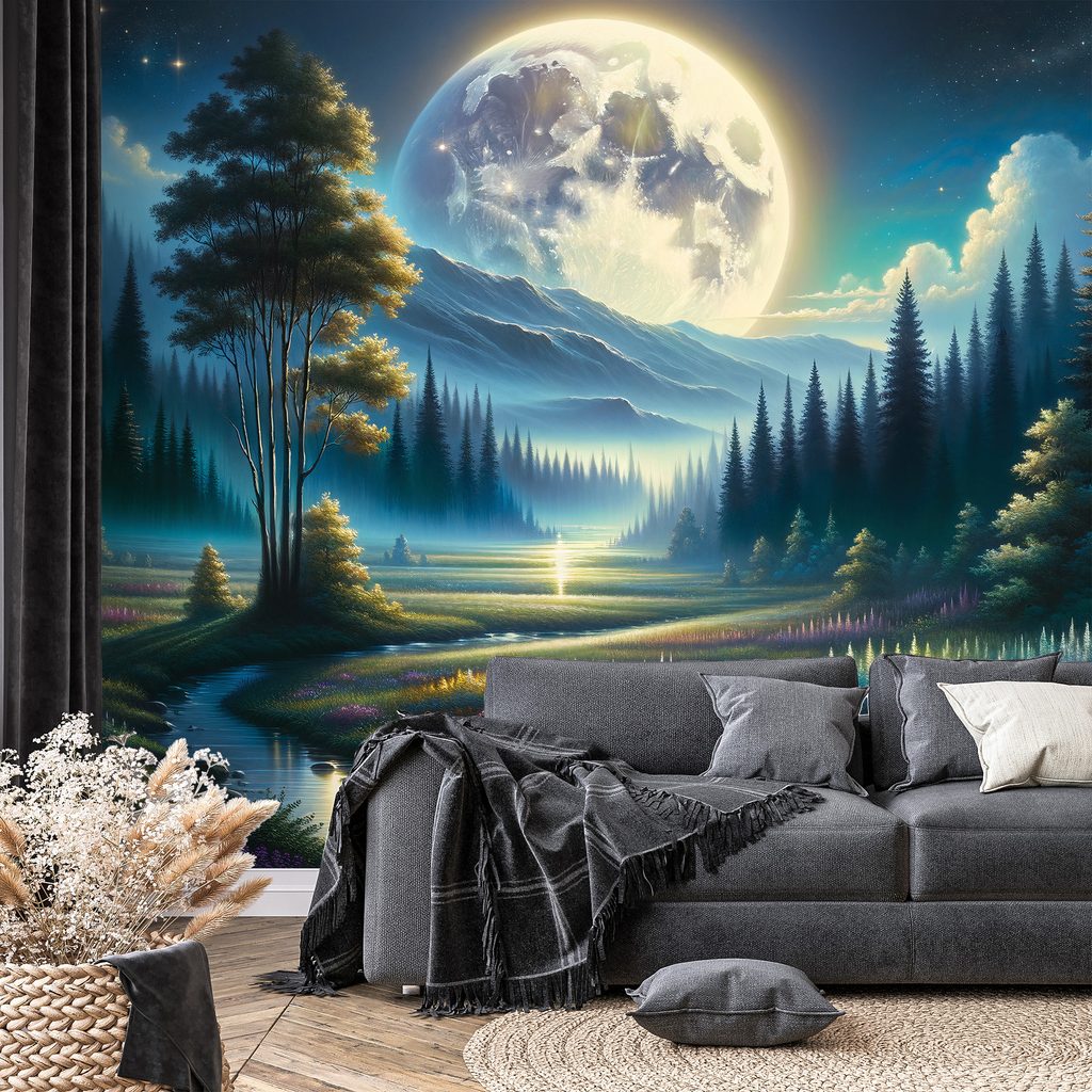 Kouzelná noční krajina s měsícem přináší do vašeho prostoru magickou atmosféru. Motiv zobrazuje klidnou scenérii s majestátním měsícem, stromy a barevnými květinami, které vytvářejí harmonický celek. Dominují zde hluboké modré a zelené odstíny, doplněné o teplé akcenty barev, které navozují pocit pohody a snění. Tato tapeta je ideálním doplňkem pro obývací pokoje, ložnice či kreativní prostory. Vysoce kvalitní materiál zaručuje dlouhou životnost a snadnou aplikaci.