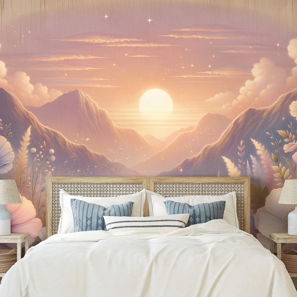 Pastelová krajina s květinami při západu slunce vytváří okouzlující atmosféru. Květy různých odstínů a jemné detaily spolu s majestátními horami a zářícím sluncem dodávají motivu hloubku a romantiku. Barvy jsou jemné a harmonické, evokující klid a pohodu. Tato tapeta se skvěle hodí do ložnic, obývacích pokojů nebo pracovních prostor, kde přinese dotek přírody. Samolepící materiál zajišťuje snadnou aplikaci a dlouhou výdrž.