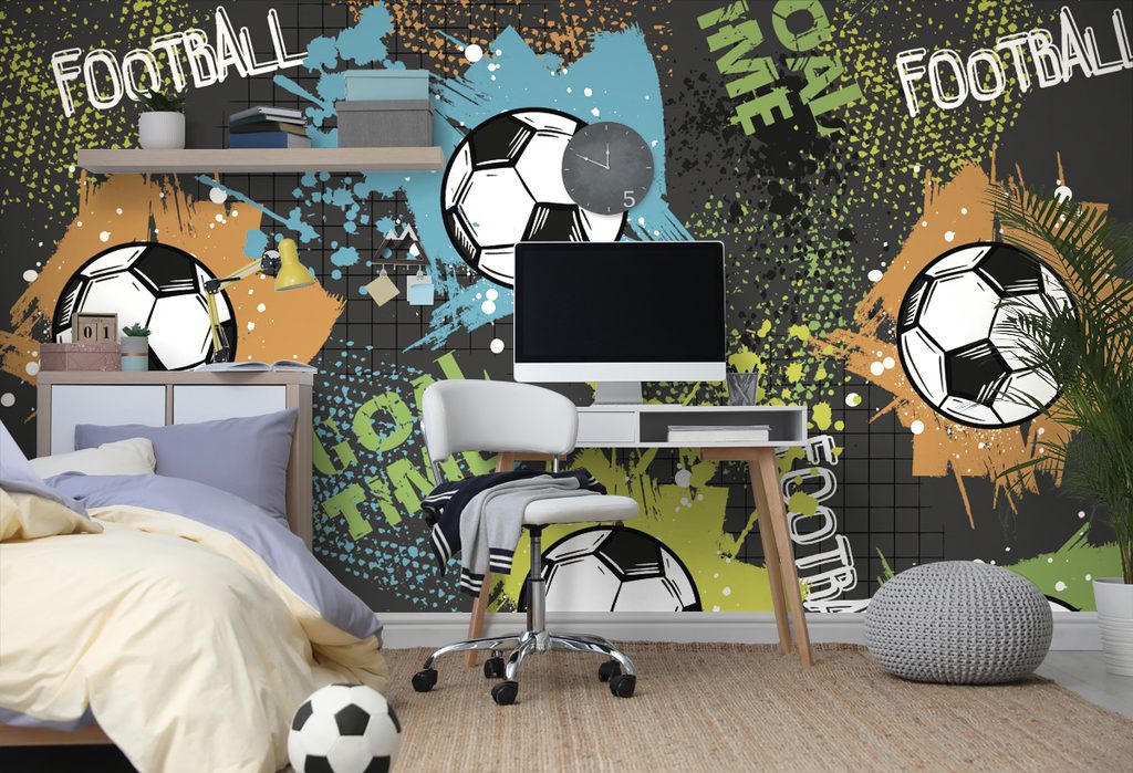 Samolepící tapeta "Čas na fotbal" přináší zábavný motiv pro všechny fotbalové nadšence. Na tapetě se střídají fotbalové míče s dynamickými barevnými skvrnami a nápisy, které vytvářejí živý dojem. Dominují jasné barvy jako zelená, oranžová a modrá, které dodávají prostoru energii a radost. Tato tapeta je ideální pro dětské pokoje nebo sportovní prostory, kde povzbudí atmosféru hry. Kvalitní materiál zajišťuje snadnou aplikaci a dlouhou životnost.