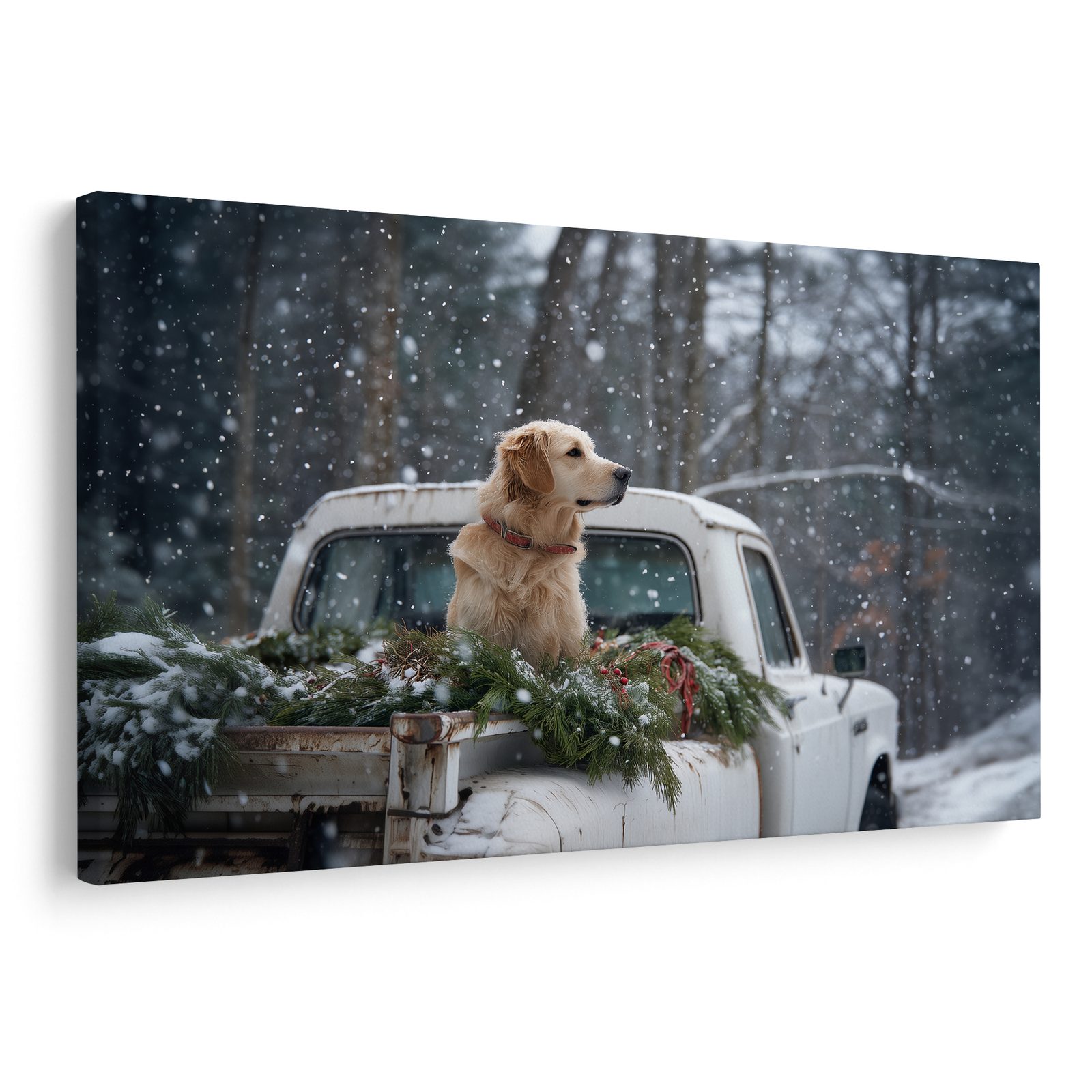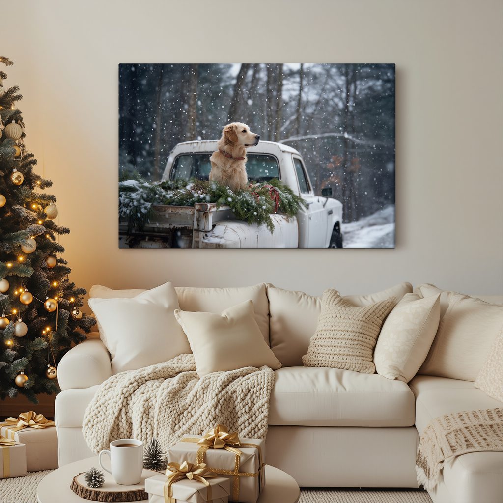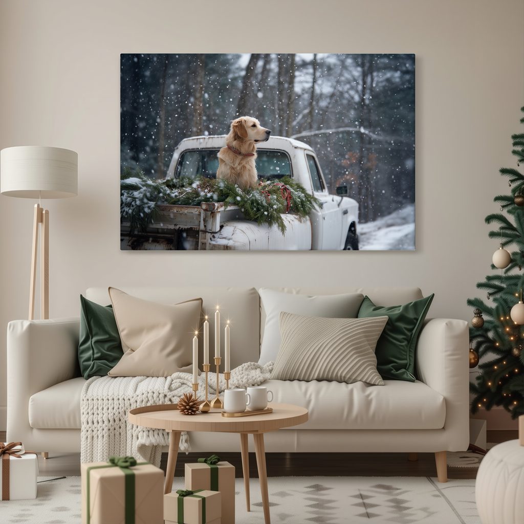 Obraz vánoční pes na zasněžené korbě