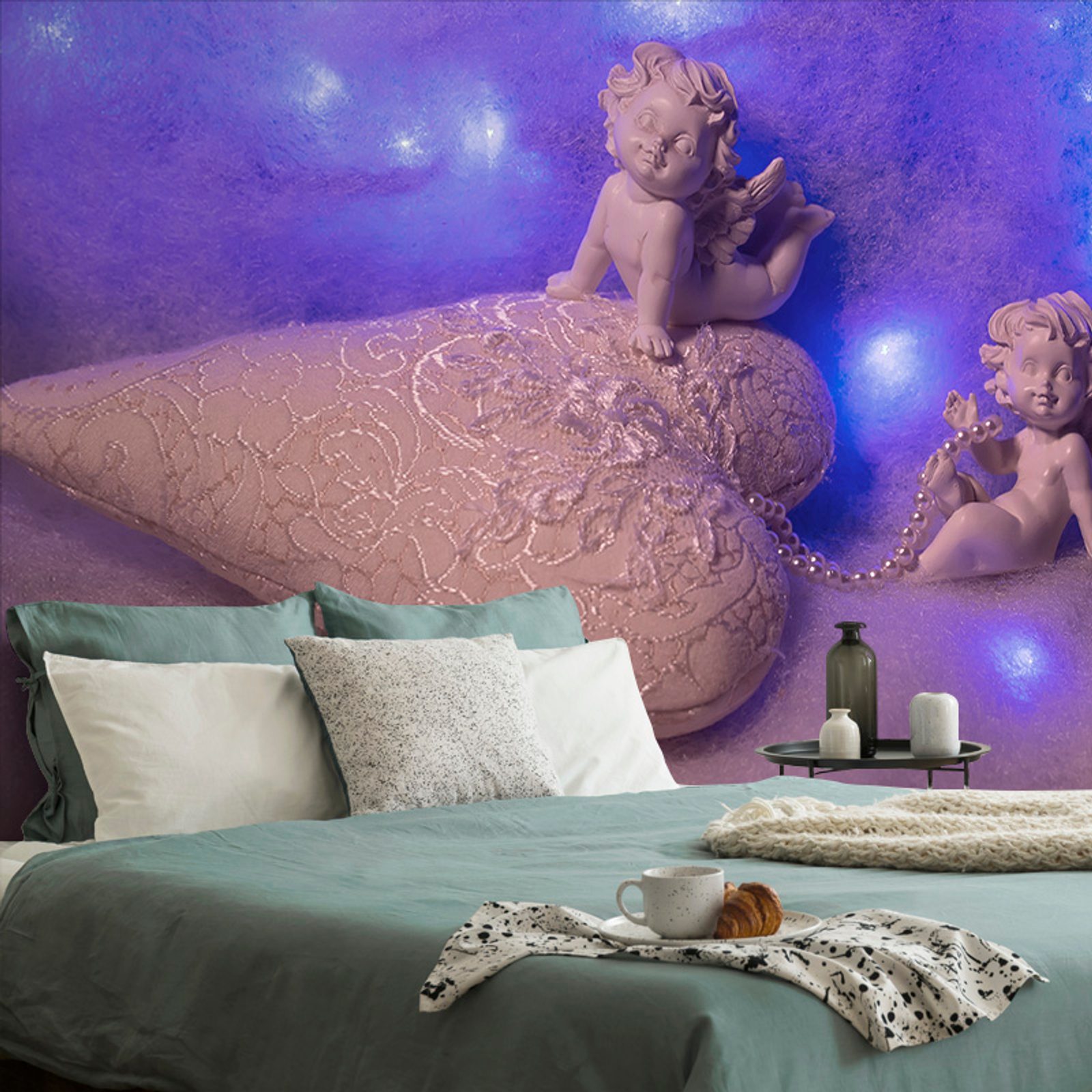 Fototapeta s motivem andílků se srdíčkem přináší do vašeho interiéru kouzelnou atmosféru. Dva roztomilí andílci se nacházejí na zdobeném polštářku, obklopeni jemným modrým pozadím a zářícími světélky. Barvy jsou měkké a pastelové, což vytváří příjemnou a snovou náladu. Tato tapeta je ideální pro dětské pokoje nebo jako dekorace pro romantické interiéry. Vyrobeno z kvalitních materiálů, zaručuje dlouhou životnost a snadnou aplikaci.