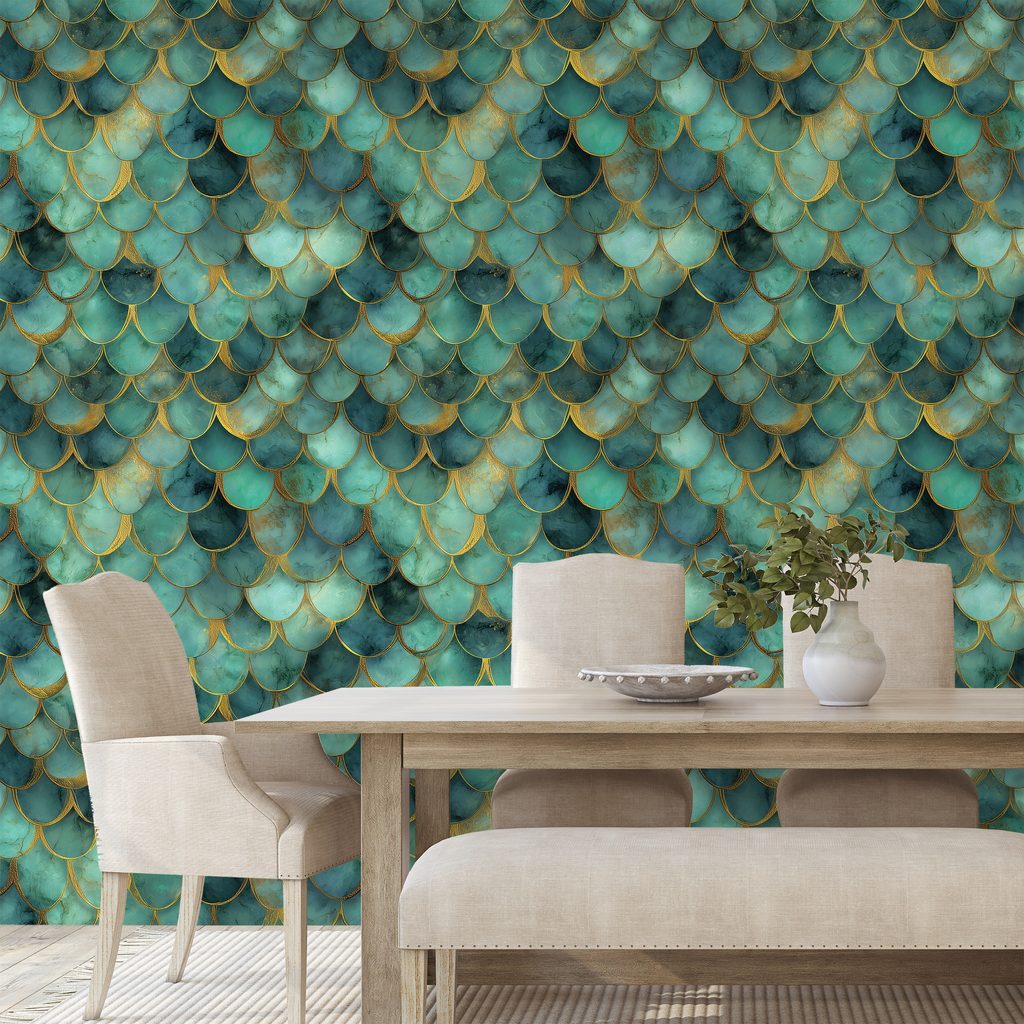 Samolepící tapeta s motivem zelených mořských šupin přináší do vašeho interiéru jedinečný nádech elegance. Detaily šupin jsou zvýrazněny jemným zlatým akcentem, který přidává na luxusním vzhledu. Kombinace zelených a zlatých tónů vytváří svěží a harmonickou atmosféru, ideální pro moderní i tradiční prostory. Tato tapeta se skvěle hodí do koupelny, ložnice nebo obývacího pokoje, kde osvěží každý kout. Díky kvalitnímu samolepicímu materiálu je její aplikace snadná a rychlá.
